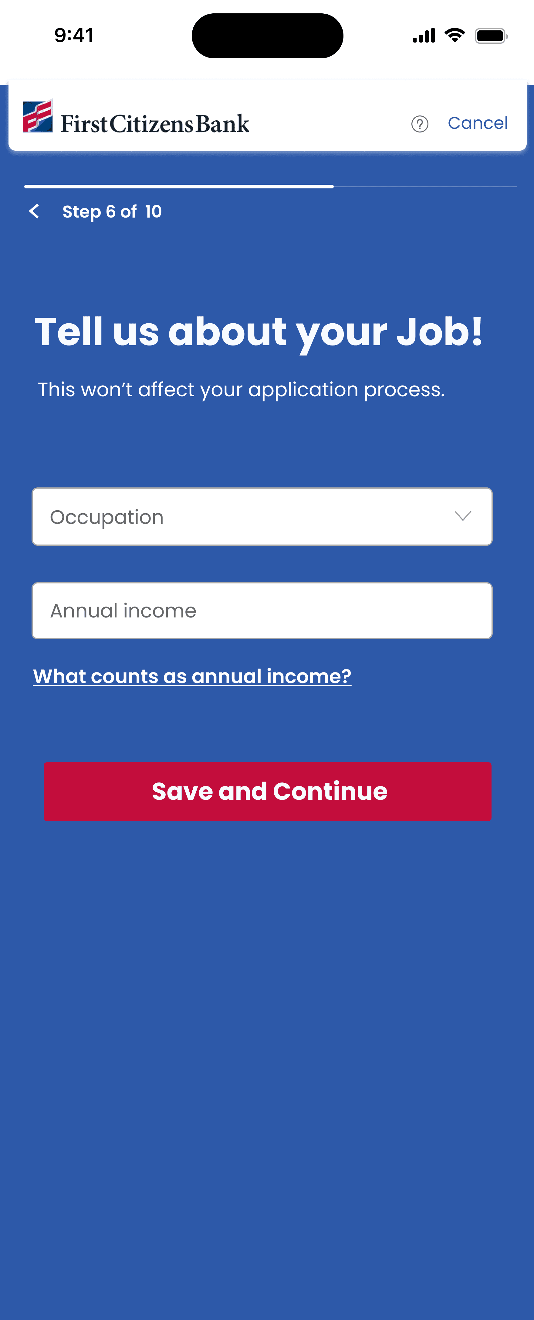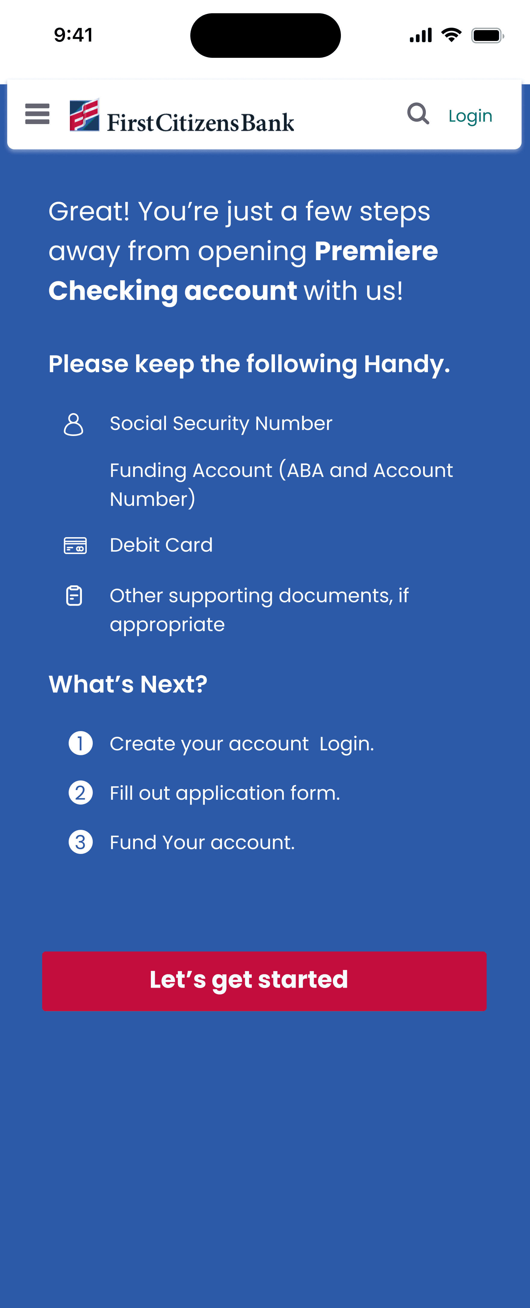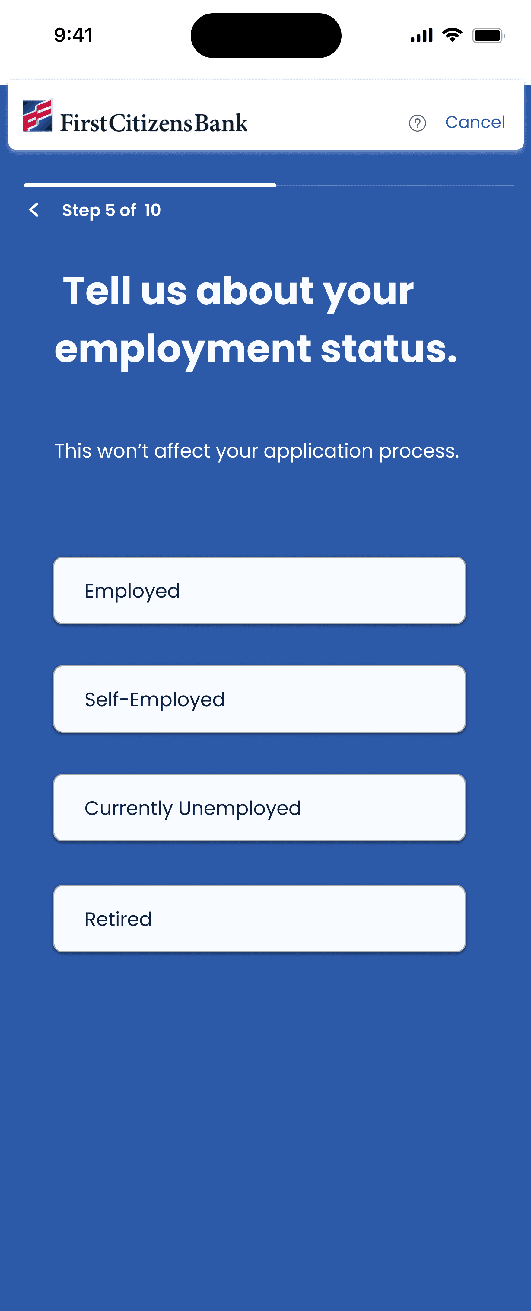 Redesigned application steps with progressive disclosure, smart form handling, and simplified validation to reduce effort and confusion, enabling a smooth, mobile-first account opening journey ultimately delivered as a hybrid mobile application experience.