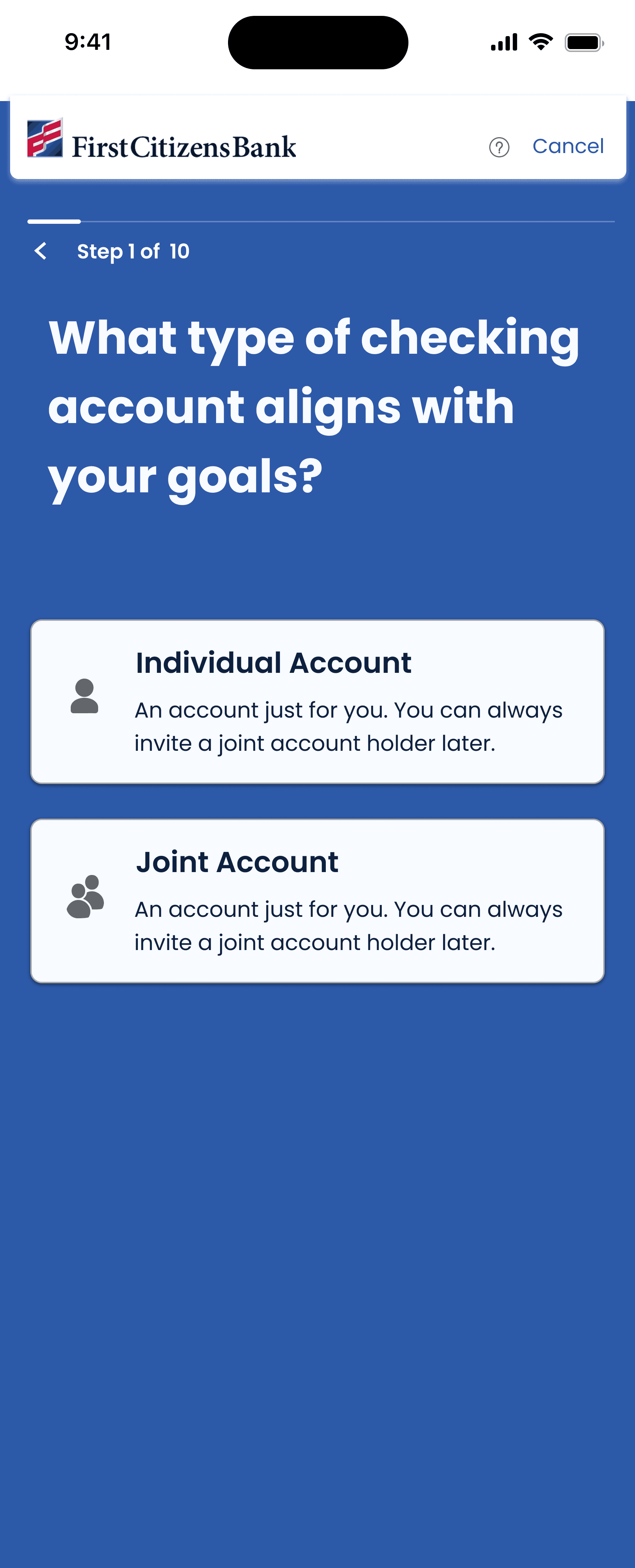 First Citizens Bank’s digital checking account opening journey creates friction across discovery, product selection, and application stages. Users struggle with unclear product guidance, lack of contextual assistance, repetitive forms, and late-stage eligibility failures resulting in frustration after investing significant time, ultimately risking abandonment and lost customer acquisition. I had Led end-to-end UX strategy and experience redesign for First Citizens Bank’s account opening journey, transforming fragmented flows into a guided, mobile-first hybrid application experience. Conducted journey analysis, defined experience improvements, and designed optimized interaction flows and prototypes, collaborating with cross-functional stakeholders to deliver a seamless, decision-driven digital onboarding experience that improved usability and business perception.